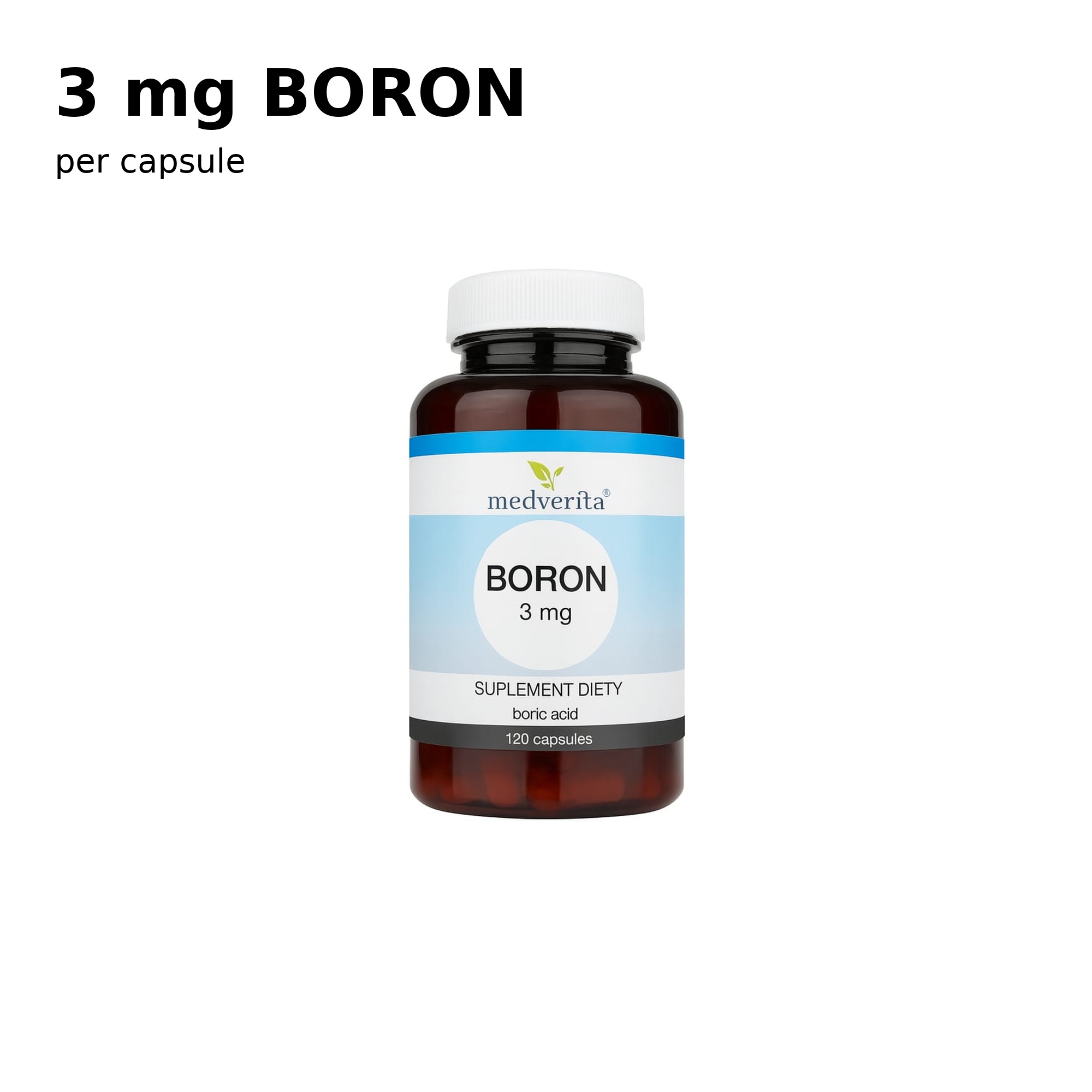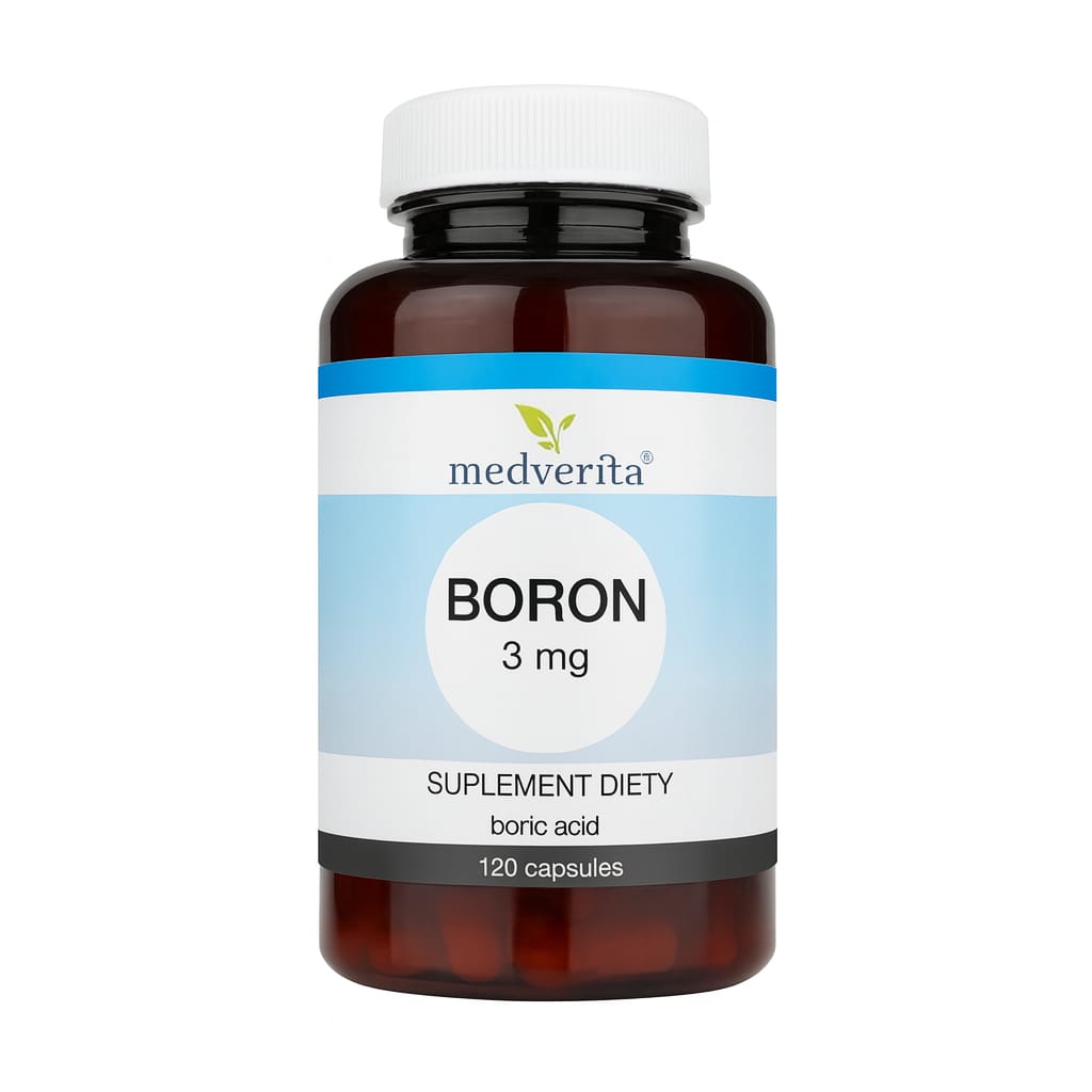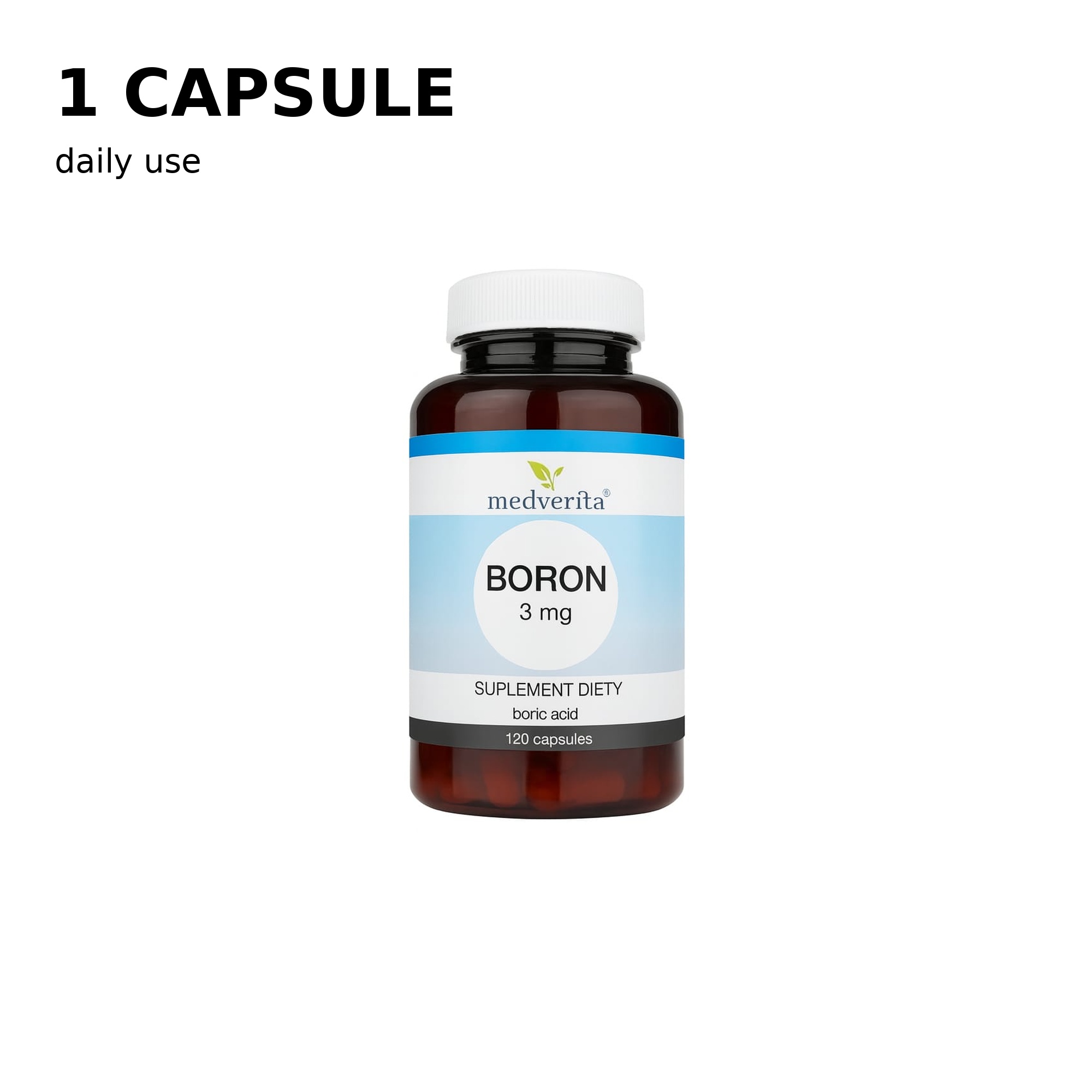 Medverita Boron 3mg capsules provide a convenient daily source of elemental boron. Each bottle contains 120 capsules designed to support daily nutrition and a balanced diet.