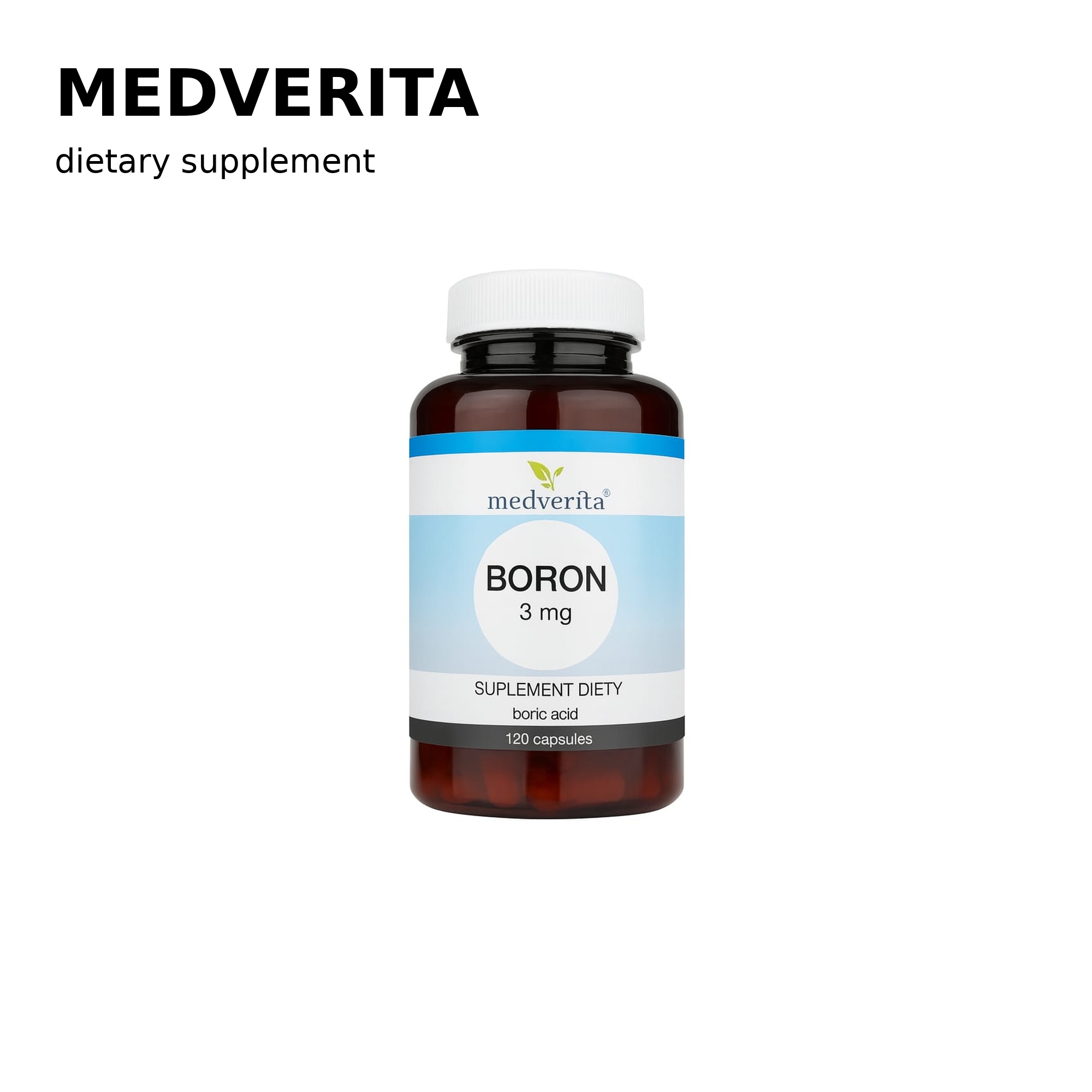 Medverita Boron 3mg Capsules are a high-quality dietary supplement providing a convenient daily source of elemental boron. Each bottle contains 120 capsules, delivering 3 mg of boron per capsule, designed to support a balanced diet and healthy lifestyle.